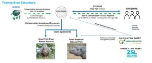 | Private Investment/Finance Structure | Outcome-based, five-year sustainable development bond – coupons fund rhino conservation and a ‘contingent conservation success payment’ made to noteholders |