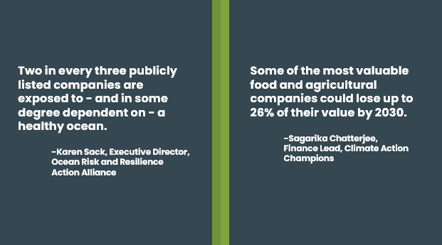 Investment into specific projects and nature-based solutions will support the immediate need for nature restoration, but we must simultaneously look to shift the trillions of dollars in the real economy away from having a negative impact on nature and towards nature positive outcomes. One lever that can support this shift is a greater recognition of the material economic risk of inaction. The framework in development by the Taskforce on Nature-related Financial Disclosures (TNFD) will support companies in assessing nature-related risk through their impacts and dependencies said guests, but we do not have to wait to nudge companies in the right direction. Evidence of material economic risk exists now. Sack highlighted, for example, that about two in every three publicly listed companies are exposed to – and in some degree dependent on – a healthy ocean. If business as usual continues, the value at risk in the blue economy over the next 15 years stands at some $8.4 trillion. Sagarika Chatterjee at the Global Financial Alliance for Net Zero (GFANZ) similarly highlighted material risk in the food sector, sharing that some of the most valuable food and agricultural companies could lose up to 26% of their value by 2030 if they do not change practices to account for climate change and biodiversity loss. Guests called attention to the fact that companies making pledges are far more numerous than companies taking action – and that is putting us all in economic peril.  Central banks and Treasury Departments must take note.
