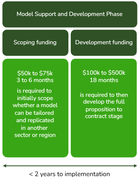 Development costs present a hurdle. Building collaborative investment vehicles, structuring long-term contracts and engaging stakeholders across a landscape all require time, technical support, and early-stage capital – often between $50,000 and $75,000 for a scoping phase, and up to $500,000 for a model to be able to start contracting and stand on its own.
