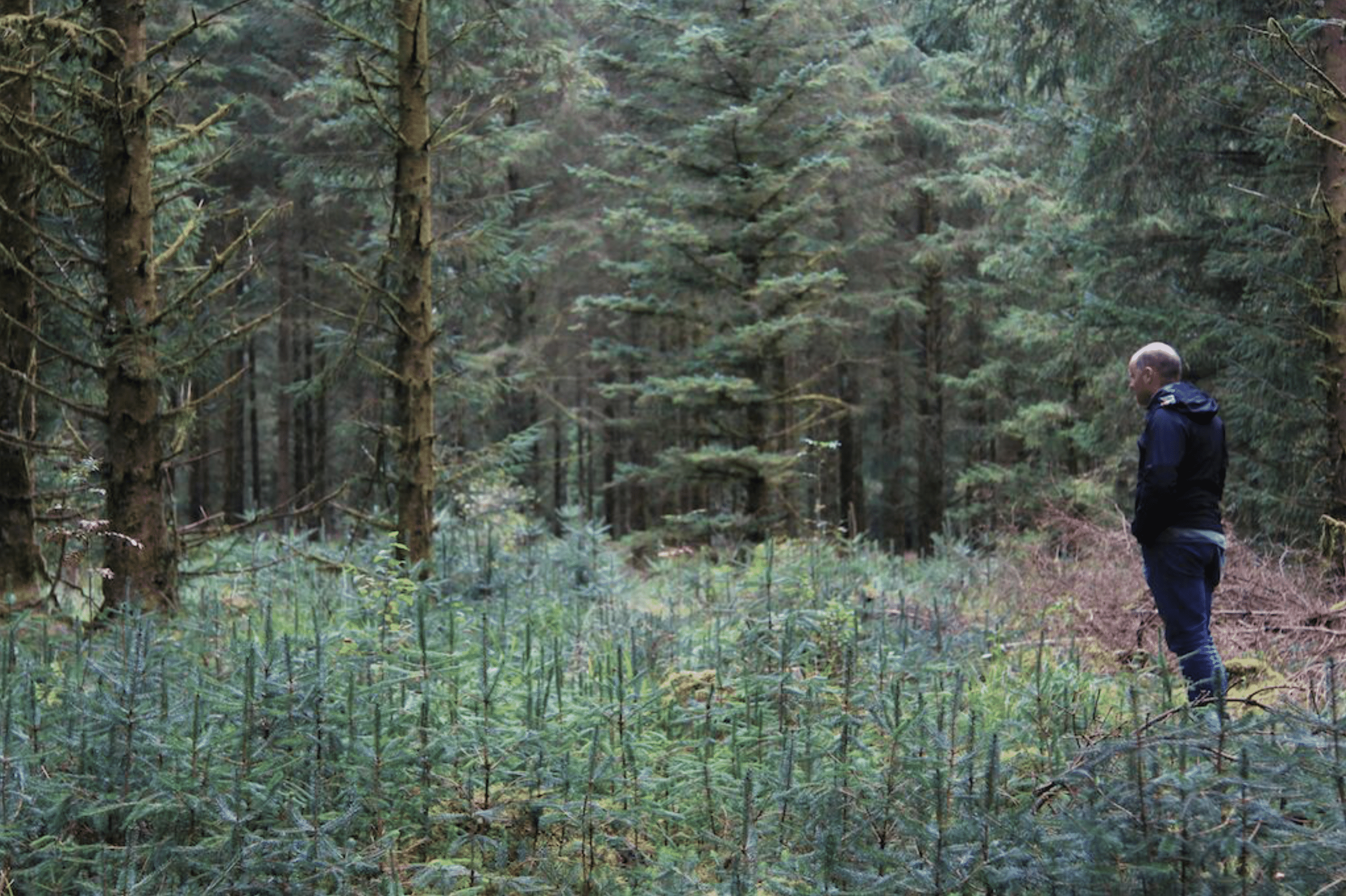 Photo courtesy SLM Partners of Paddy Purser, of PTR, standing in a forest gap filled with naturally regenerating spruce seedlings.