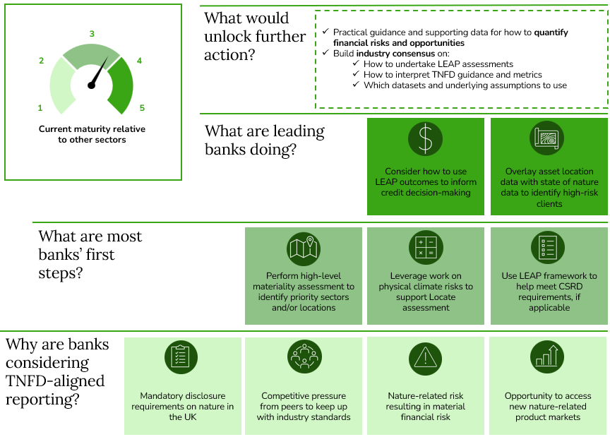 - Banks are also piloting and considering TNFD-aligned reporting to (i) ensure they keep pace with action on nature from peers in the market, (ii) manage their exposure to nature-related financial risk, and (iii) inform new product development.