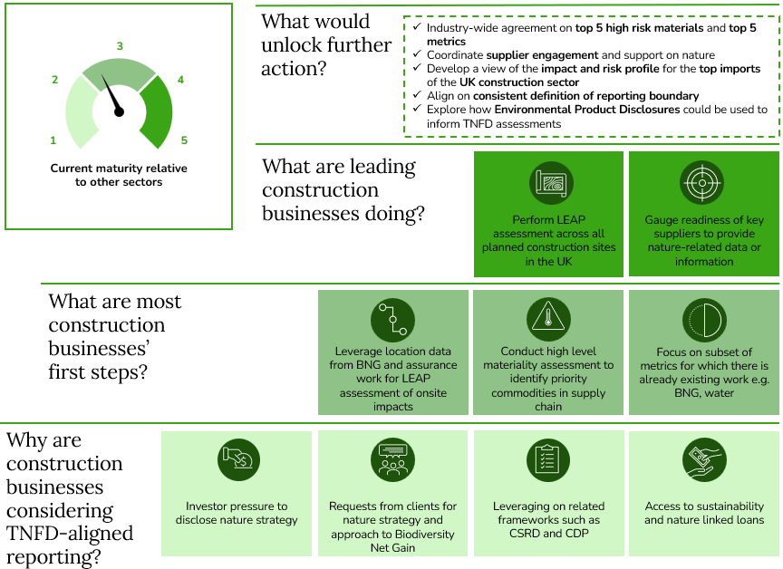 - Some businesses are holding exploratory workshops with prioritised suppliers within their value chain to share early thinking around nature, understand whether this is on suppliers’ radars, and assess what data might be available. Construction businesses are keen to work together as an industry to identify which specific nature-related information or data is required from suppliers to support TNFD-aligned reporting before issuing any data requests to their supply chain.