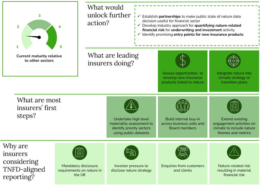 - Action on TNFD is also driven by requests from investors and shareholders as well as proactive enquiries from customers and clients on how the business is dealing with nature. For example, one integrated insurer-asset manager-savings business has engaged with its pension and savings customers to understand their demand for the business to develop a strategy on nature. This created a pull through from the savings customer base that enabled the asset management function to invest in upskilling on nature.