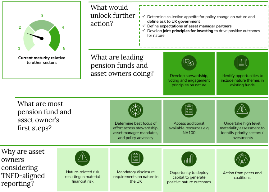- Pension funds and asset owners are interested in how they can deploy parts of their portfolio to generate positive outcomes for nature, reflecting interest from pension holders to generate positive environmental benefits with their savings.